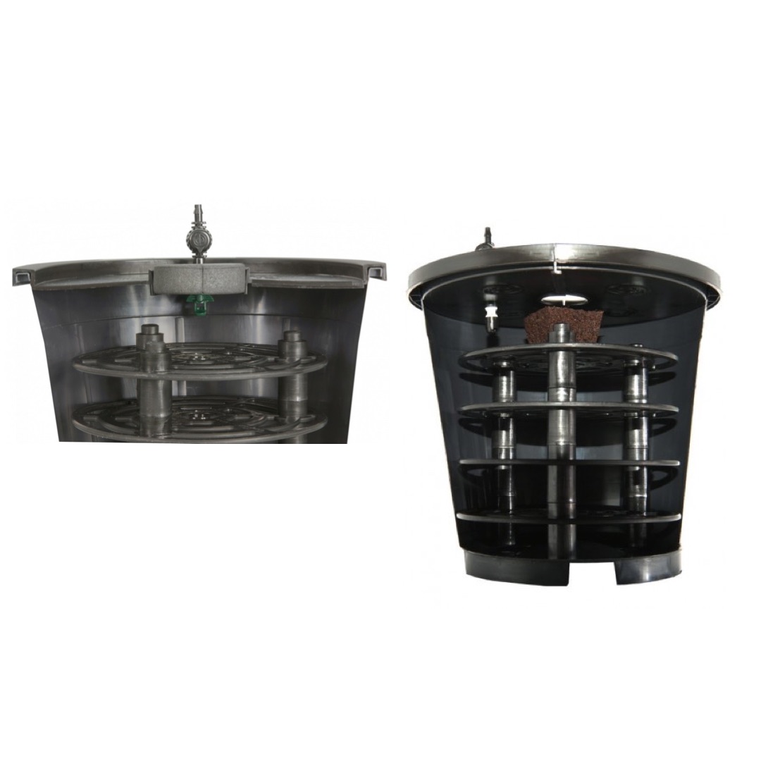 Mit den AERO GROW Töpfen verzichtest du vollständig auf herkömmliches Wachstumsmedium und sparst damit auch Folgekosten. Die Wurzeln werden über eine rezirkulierende Nährlösung optimal versorgt. Sie nehmen die Nährstoffe aus der Nährlösung auf, die z. B. über Sprüher zugeführt wird. Durch die Anordnung auf mehreren Ebenen erhalten die Wurzeln maximale Versorgung mit Luft (CO₂) und Nährstoffen. Der ständige Austausch von frischer Luft und zirkulierender Nährlösung maximiert die Wurzelzone und optimiert das Wachstum.
