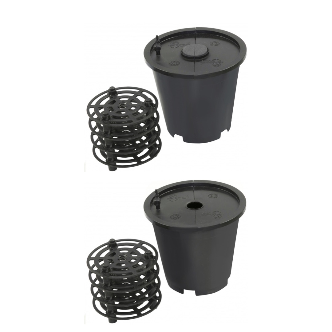 Mit den AERO GROW Töpfen verzichtest du vollständig auf herkömmliche Substrate und sparst damit nicht nur Platz, sondern auch Folgekosten. Die gesamte Wurzelzone wird über eine rezirkulierende Nährlösung optimal bewässert. Die Wurzeln nehmen die Nährstoffe über feine Sprühsysteme auf, legen sich auf den Ebenen des Einsatzes ab und erhalten dadurch eine perfekte Versorgung mit Luft (CO₂) und Nährstoffen.