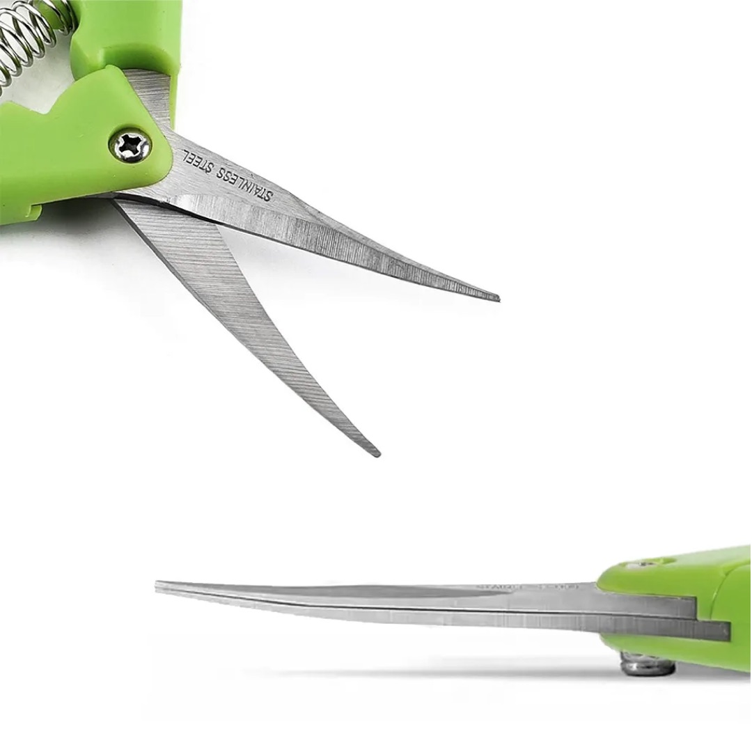 Praktische Ernteschere mit gebogener Klinge aus rostfreiem Edelstahl (Stainless Steel) für präzises Schneiden. Ideal für feine Arbeiten beim Trimmen und Ernten von Pflanzen.
