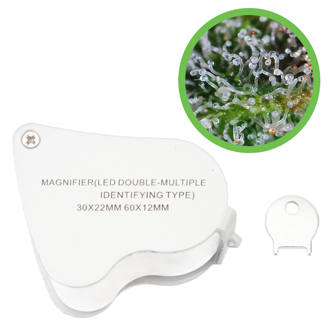 Kompaktes Handmikroskop mit 30- und 60-facher Vergrößerung, ideal für Grower zur präzisen Trichom-Betrachtung. Ermöglicht eine klare Bestimmung des Reifegrads durch detailreiche Darstellung der Harzdrüsen. Die integrierte LED-Beleuchtung sorgt für optimale Sicht bei allen Lichtverhältnissen.