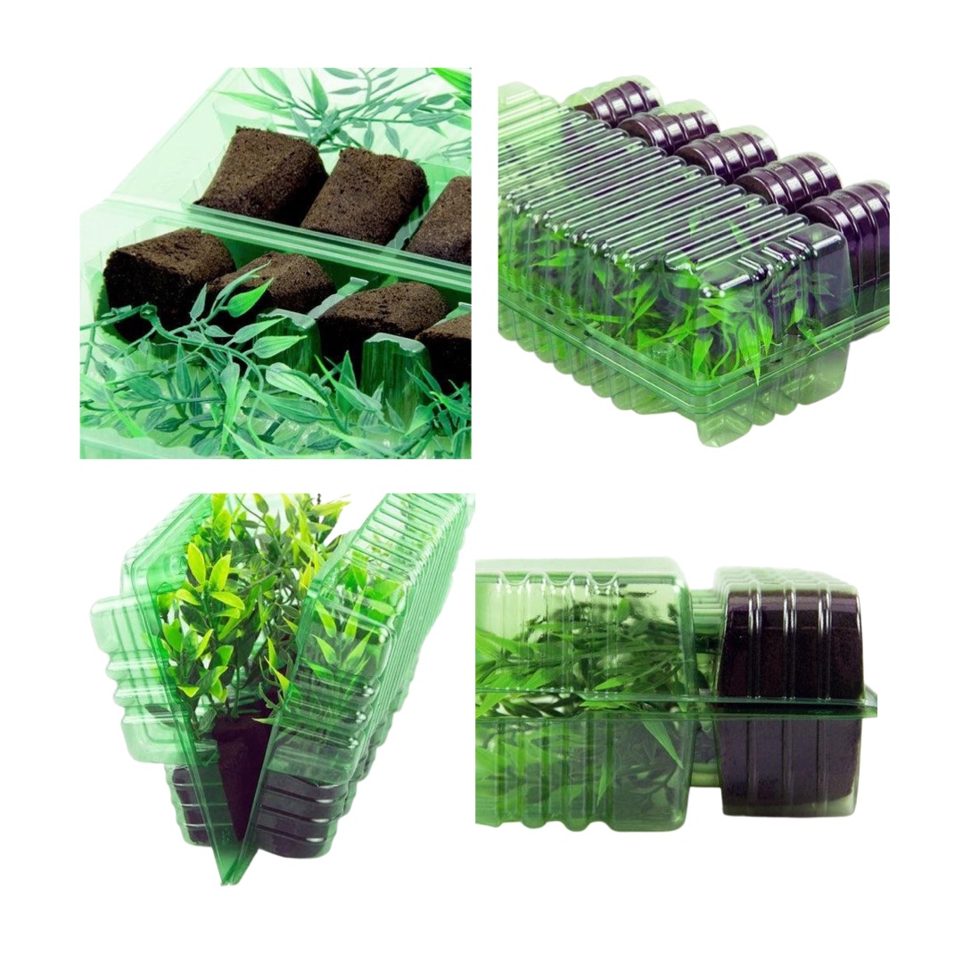 Die Steckling-Versandverpackung ist speziell für den sicheren Versand von bis zu 10 Stecklingen oder Klonenkonzipiert. Sie eignet sich für Stecklinge mit einem Wurzelballen von Ø 38×50 mm und einer Pflanzhöhe von ca. 14 cmab Stammöffnung. Jede Pflanze hat eine Stammöffnung Ø 2 cm, passend für gängige Anzuchtmedien wie Jiffy’s, Eazy Plugs und Steinwoll-Anbaublöcke.